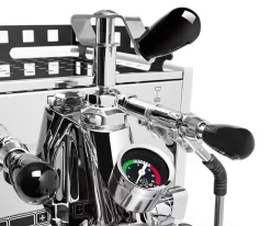 The Black version of the Bezzera Aria includes rosewood accented steam, hot water, and E61 lever knobs as well as rosewood handle portafilters.