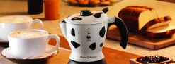 The Bialetti Mukka Maculata 2-cup latte and cappuccino maker is one of the simplest and most delightful ways to make velvety milk-based coffee drinks for the morning and afternoon. All it takes is 5.4oz of water added to the base, 18 grams of fine ground coffee in the basket, and 7oz your preferred milk in the upper chamber. At the top of the milk chamber, a large round button can be pressed downward to make a cappuccino, or lifted up slightly to make a latte. Place the Mukka Maculata on a stovetop and the magic happens. Espresso will mix together with milk foam to create a classic, delicious beverage.