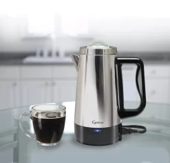 It’s a blast from the past! Capresso’s Perk is an electric percolator with some modern considerations. Made of durable stainless steel, the Perk can rapidly brew 4 – 8 / 4 – 12 cups of coffee in less than 1 minute per cup. Start by filling percolator with water and ground coffee using the indicators located on the inside. Then simply plug in and brew.