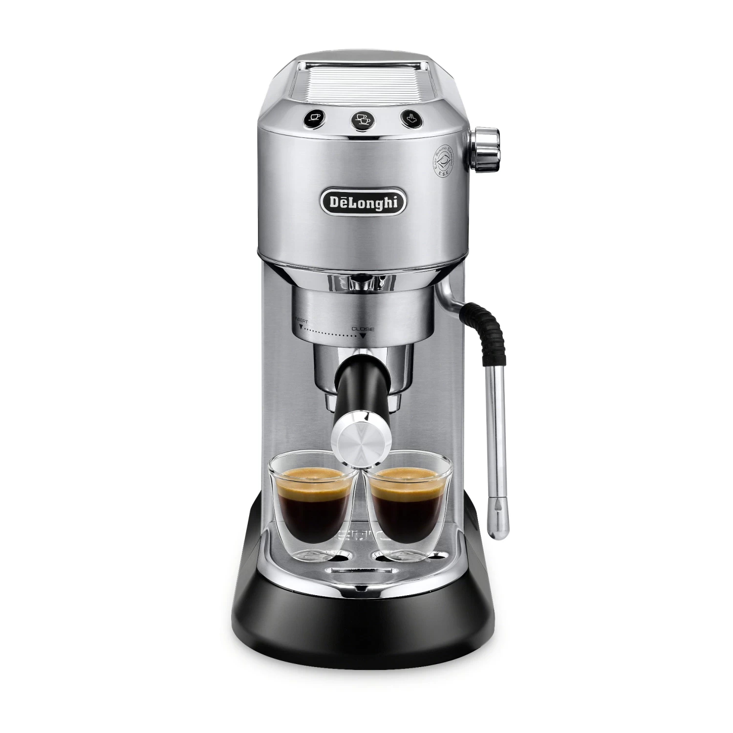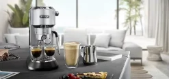 The De’Longhi Dedica Arte is a stylish semi-automatic espresso machine with a sleek and compact design and gorgeous stainless steel housing. Featuring a more barista oriented design than the other members of the Dedica family, the Dedica Arte is equipped with a commercial steam wand for traditional milk frothing, and with some practice, can produce latte art quality milk foam.