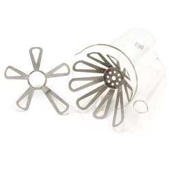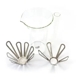 E&B Lab’s Pour Over Set comes with a functional, handmade borosilicate glass carafe and two uniquely-made flower paper filter holders. The carafe is thermoshock resistant so you can safely brew your coffee in this hand-crafted carafe up to 248°F with a capacity of 18 fluid ounces. The flower drippers grip Chemex and Hario paper filters to support the brewing process and the steel construction prevents changes in the coffee’s temperature.