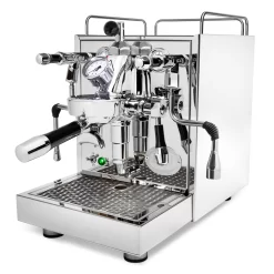 From a design standpoint the Mechanika MAX shares a good amount of DNA with the Mechanika VI Slim with the same cup railings, similar wrapped body panels, and ECM styled E61 group. The steam and hot water valves have received a notable improvement, having been upgraded to spring-loaded chrome tipped joysticks found on the ECM Technika V and Synchronika espresso machines. Similar to those machines, the inclusion of a rotary pump means whisper quiet brewing and allows the machine to be connected directly to a water line.