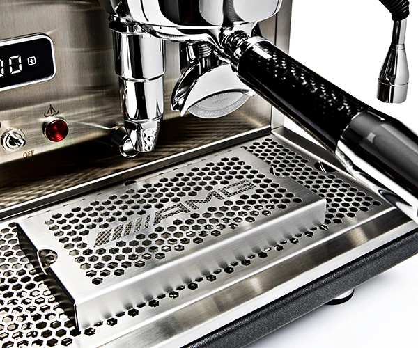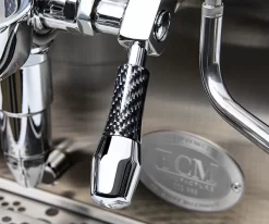 - Carbon fiber portafilter and tamper handles, E61 brew lever, steam and hot water taps.