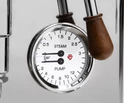 Additionally, the machine can be run with the included 2.5L water reservoir, or can be plumbed in directly to a water line. A truly unique aspect of this setup is that the water reservoir can be moved to any of the side or back panels to suit your spacing needs. The included anti-burn steam and hot water wands are multidirectional so they can accommodate just about any cup or mug size, and operated by responsive and tactile knobs with spring closure. External pressure gauges for steam, the pump, and group head and also included.