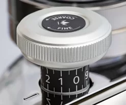 Grind adjustment is managed by the stepless micrometric regulation system, allowing users to to make incredibly precise adjustments with the comfortable knob to the right of the display. Because the top burr is stationary, when opening the Edison 65 SD for regular maintenance, your grind setting is preserved. This eliminates the need for dialing your grinder back in. Single and double doses can be programmed within 1/10th of a second via the touch display; you can also lock your doses to prevent accidental changes as well as grind continuously using the manual “Extra Dose” mode.