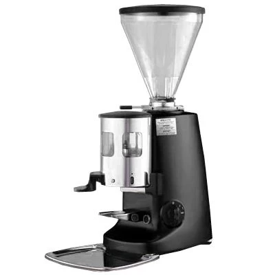 The Mazzer Super Jolly is a stepless, doser grinder with manual timed grinding functionality. If you like the look and feel of the Mini, but need a higher capacity and bigger burrs for a more high octane grinding situation, the Super Jolly is the logical next step up. Its 350 watt motor is a notable upgrade from the Mini’s 250 watt one, and the extra large hopper holds significantly more beans than the short hopper on the latter. We find the Super Jolly impressive and simple to use by way of a turning a timer dial anywhere up to sixty seconds. The grounds are deposited into a doser, which can be adjusted to dispense anywhere from 5.5 to 9 grams into your portafilter with a flick of the dosing lever. Those grounds can then be easily tamped with the doser’s built-in tamper. Both the doser and its built-in tamper are designed with high-speed scenarios in mind, where you want to be able to quickly grind and tamp for several drinks in a row. We love it around the office for this fact alone, and think it would be excellent in a cafe setting, or a serious home entertainer.