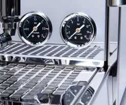 In combination with the engineered thermosyphon system in the E61 group, the Pro 500 PID with Flow Control lends a level of temperature stability previously unheard of in a heat exchanger espresso machine. The need for cooling flushes is eliminated, removing a considerable limitation from this class of espresso machine. When set to a temperature of 256° Fahrenheit, pressure stabilizes for near indefinite steaming while eliminating the necessity of a cooling flush under most circumstances.