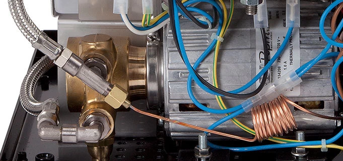 Inside the machine, you’ll find the internal components to be incredibly well-organized, which is an often underappreciated touch that you don’t see in many other machines. Copper coils and water lines trace from one brass fitting to the next. Even the more delicate electronics are shielded from any humidity, neatly tucked away to one side of the machine.