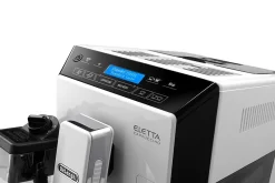 The DeLonghi Eletta Cappuccino ECAM 44660W features clean white paneling, programmable specialty brewing, and a modest price tag. The DeLonghi Eletta Cappuccino elevates the standards for home super-automatics. The intuitive touch metal display will have you programming custom one-touch beverages with ease while the Lattecrema system dispenses beautifully frothed milk for lattes, macchiatos, and more.